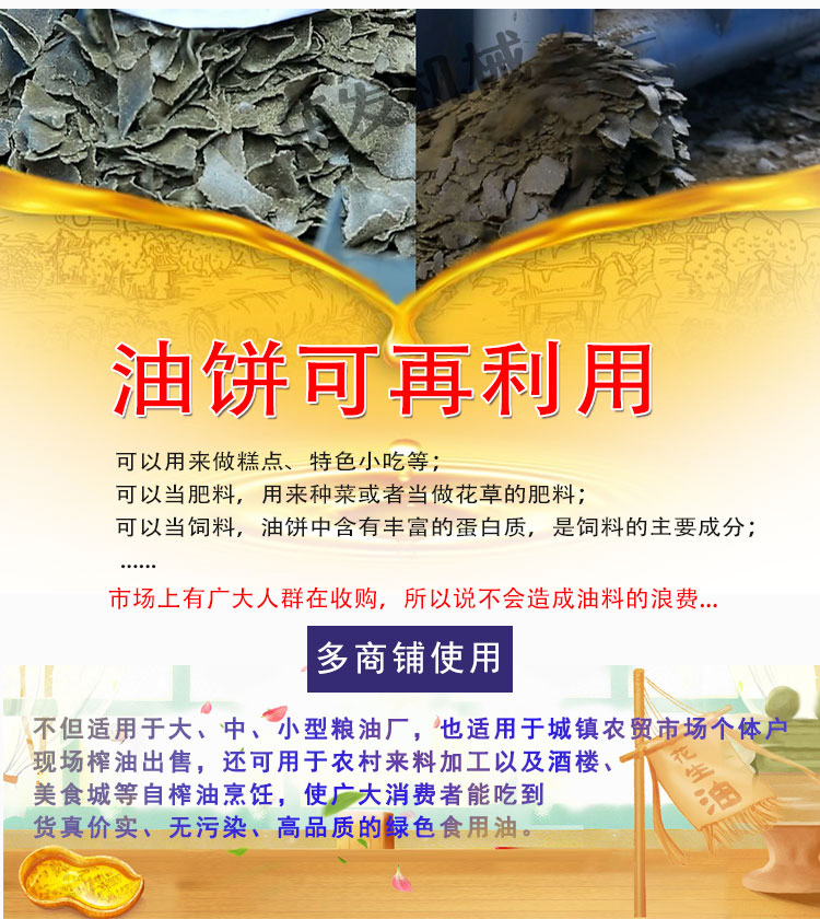 油機(jī)都是一機(jī)多用的,已經(jīng)不是傳統(tǒng)的之可以壓榨一種油料了。樂發(fā)榨油機(jī)可以壓榨花生、大豆、芝麻、菜籽,棉籽、植物等20多種的油料,實(shí)現(xiàn)一機(jī)多用,為投資者帶來(lái)更多的利益。