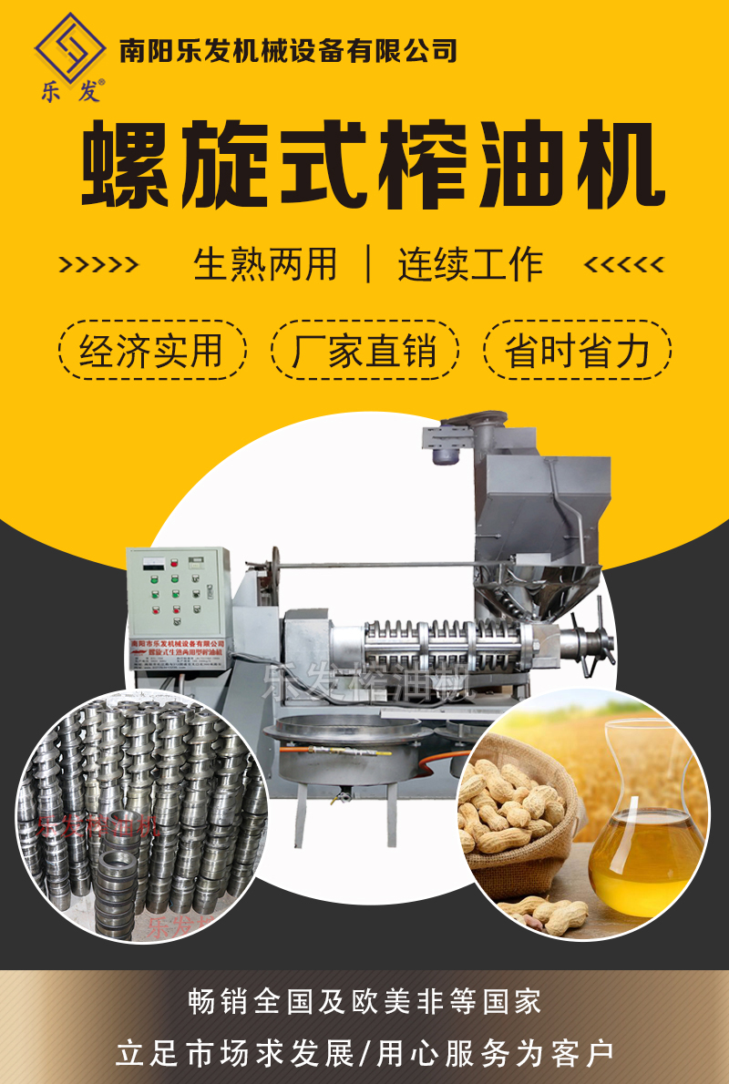 花生榨油機(jī),南陽(yáng)樂發(fā)機(jī)械生產(chǎn)螺旋榨油機(jī)22年,針對(duì)油廠實(shí)際情況,南陽(yáng)樂發(fā)機(jī)械推薦合適的熱榨或者冷榨工藝,樂發(fā)牌花生榨油機(jī),制取食用油健康符合人們生活需求。