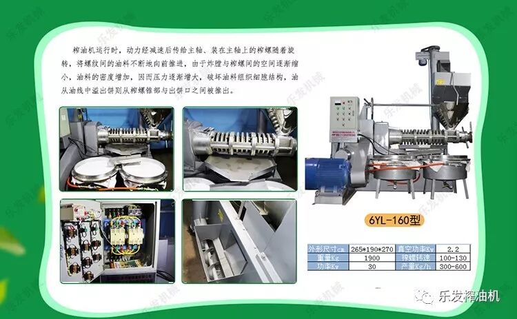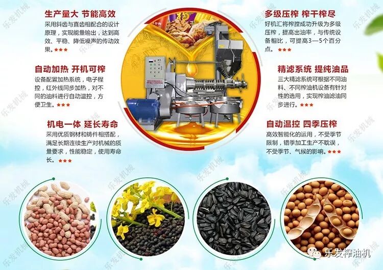 樂發(fā)全自動榨油機(jī),新型制造工藝,美觀大方,經(jīng)濟(jì)環(huán)保,性能穩(wěn)定耐用,占地面積小,操作簡單,好學(xué)好用;出油率高,油質(zhì)純正,油香濃郁,油品清亮,無須過濾;是您開油坊、辦油廠的理想榨油機(jī)。