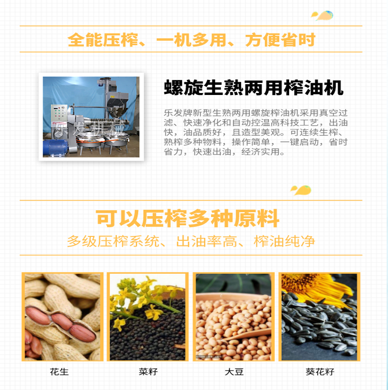 樂(lè)發(fā)牌新型生熟兩用螺旋榨油機(jī)采用真空過(guò)濾,快速凈化和自動(dòng)控溫高科技工藝,出油快,油品質(zhì)好,且造型美觀。