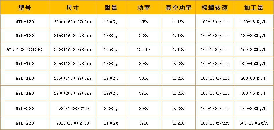 6YL-220 | 29201900*2700 | 2000kg | 37KW | 2.2KW | 100-130r/min | 400-800Kg/H |