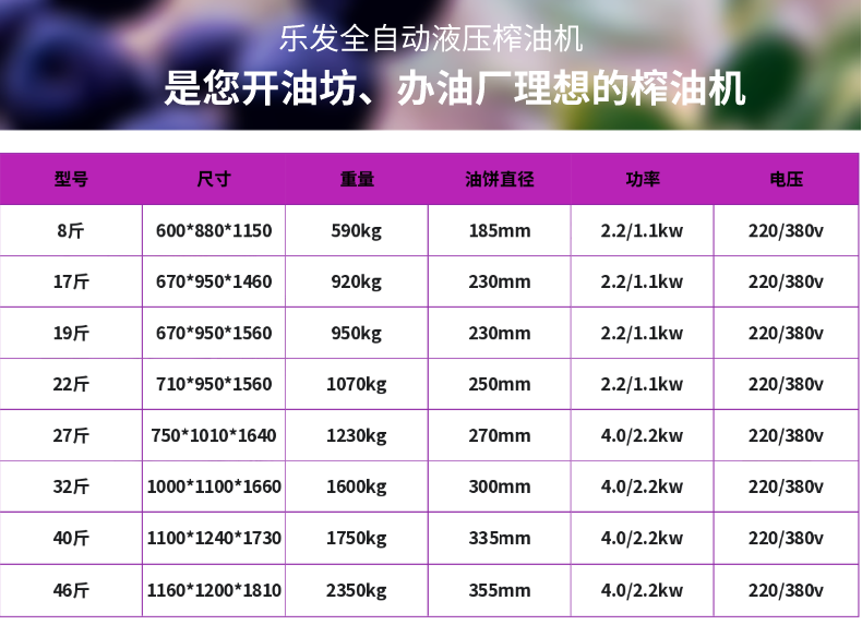 型號(hào) | 尺寸 | 重量 | 功率 | 電壓 | 油餅直徑 | 加工量 |